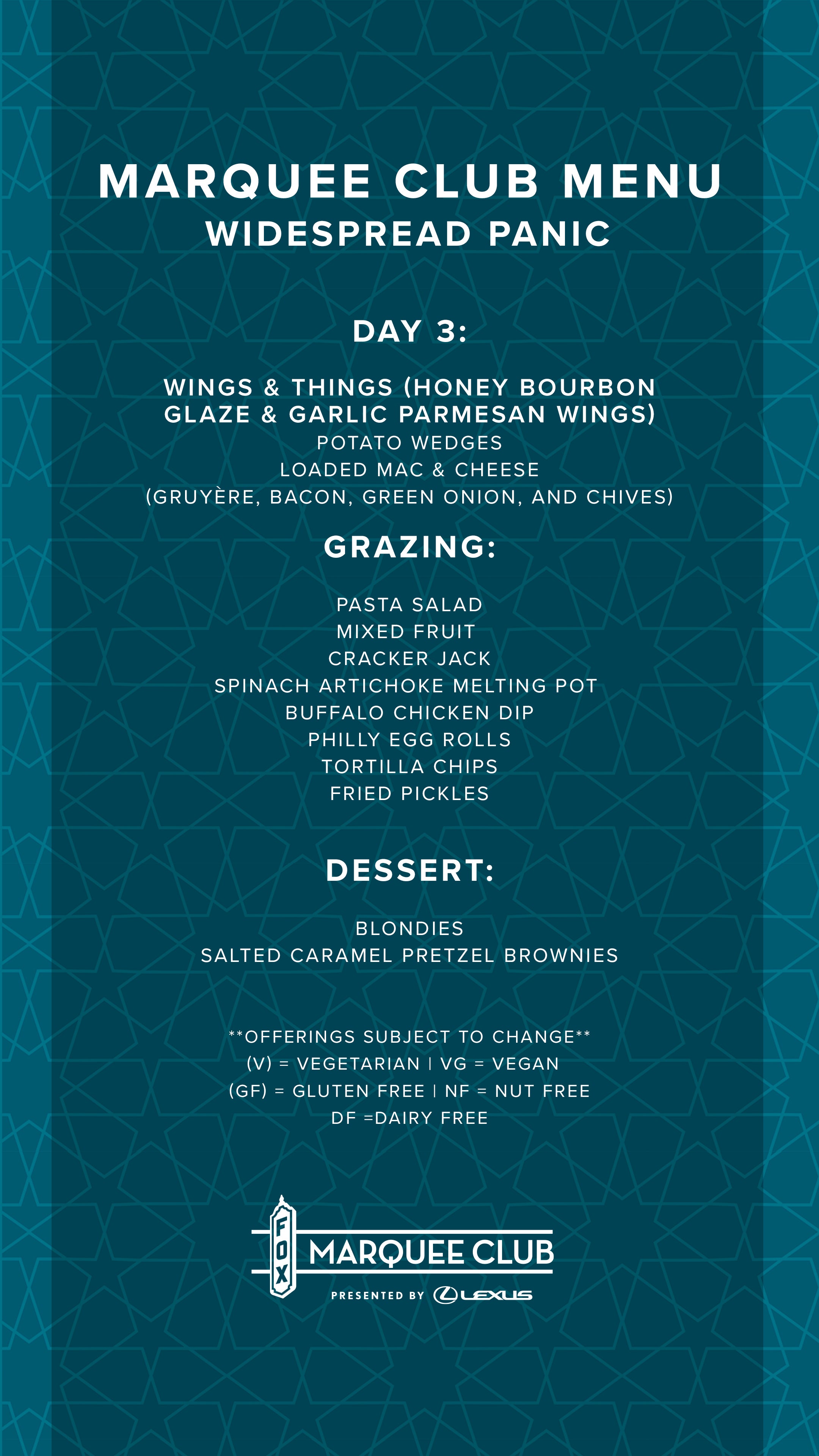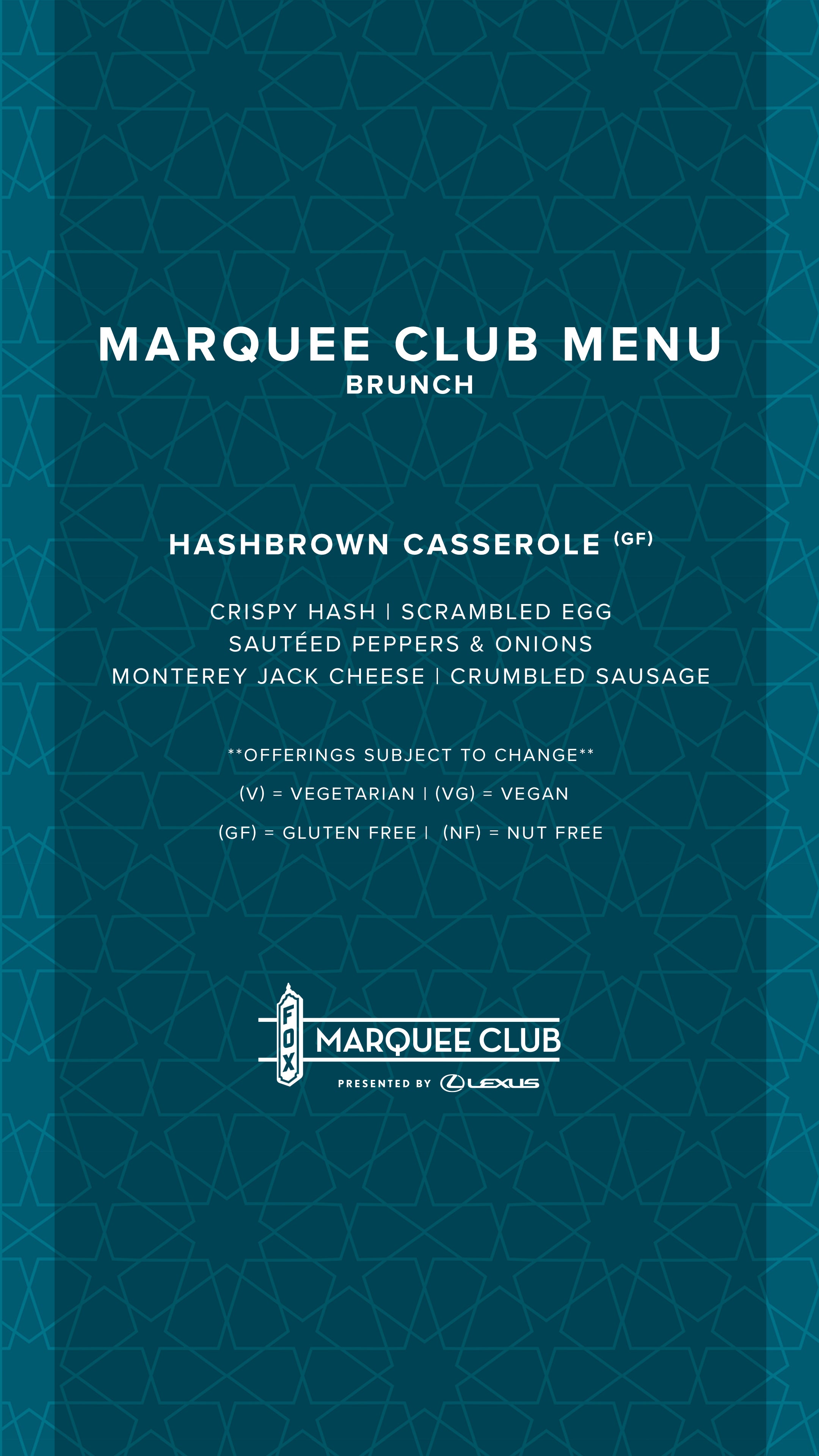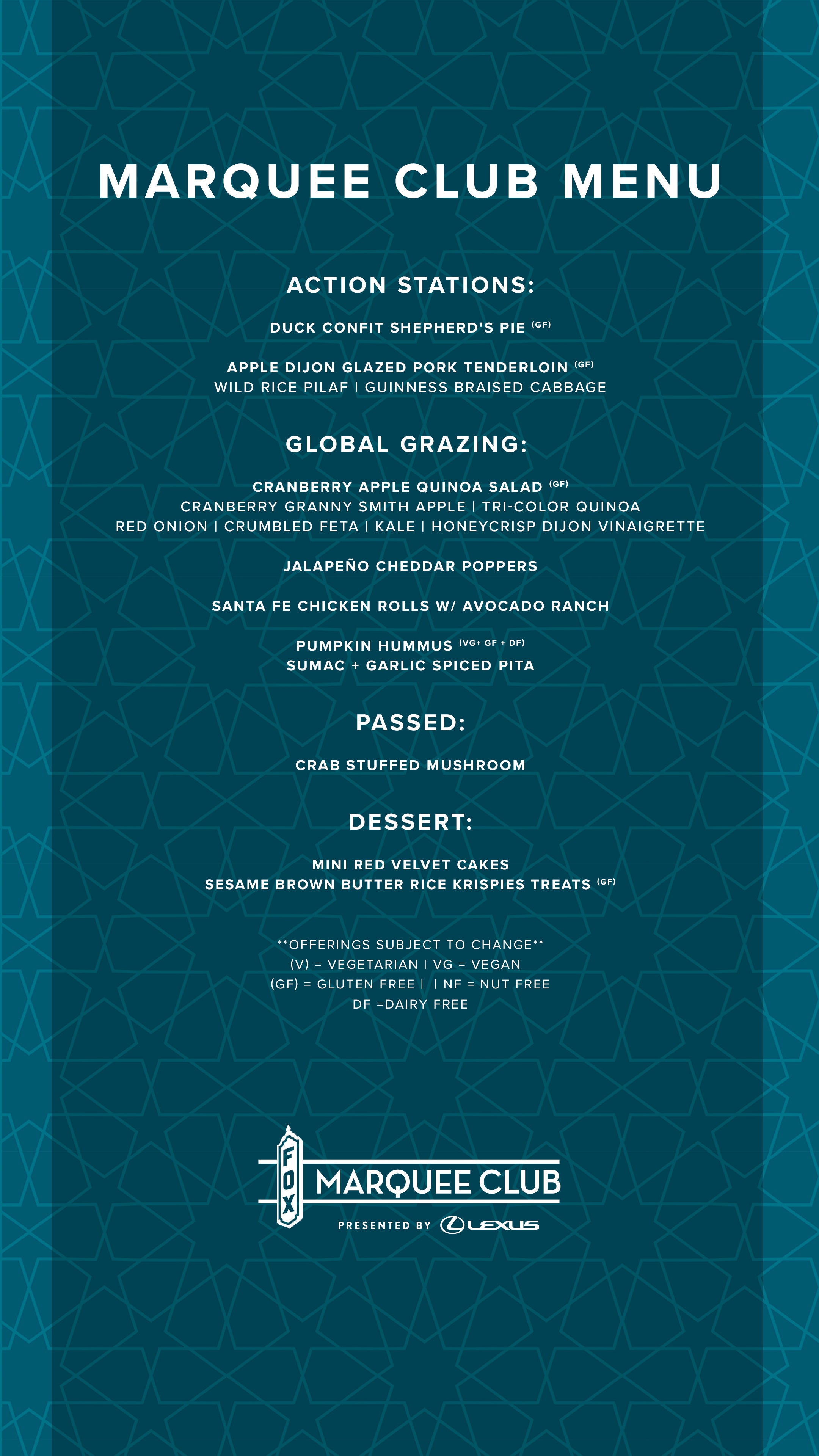 Join us during your next visit to the Fox Theatre at the Marquee Club presented by Lexus for an elevated theatre experience. This three-story, premium club is open during all public events and intended to elevate your theatre experience with amenities like pre-show food, premium bars, private restrooms, rooftop access, and more.